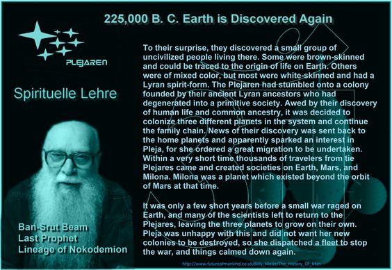 73. Then, when the idolism had been abolished in the Plejara systems and the leader Plejara had died, a new intelligence developed on the Earth through the descendants of the feral abandoned ones, which led to the fact that the Plejara system inhabitants, who were constantly observing the Earth, came forward with new expeditions to Earth and once again built up a culture in the same manner as they built up a culture on the fourth planet, namely on the world of Malona.